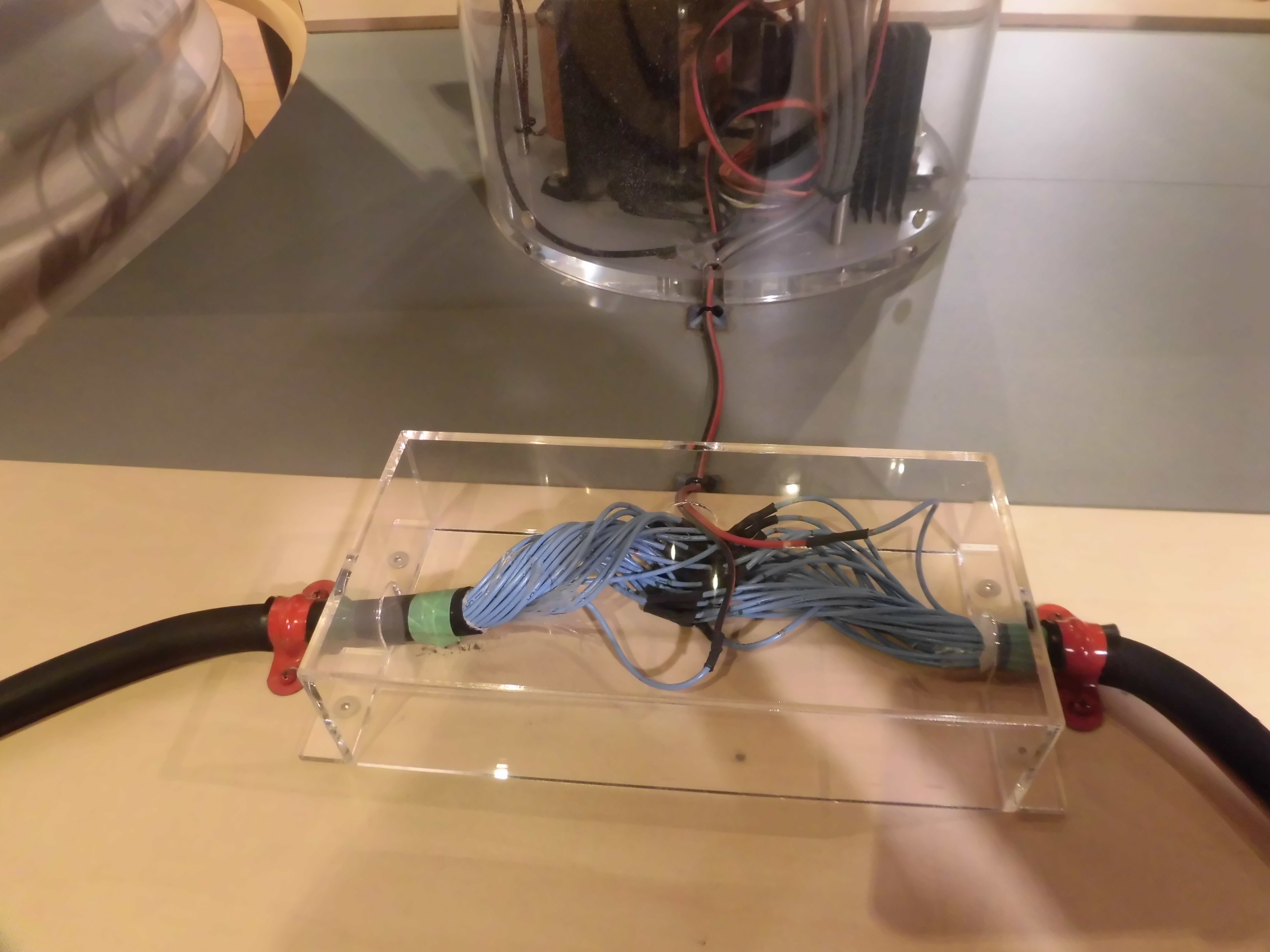 視線で動かす車いすを見た研究者は真夏でも使えるアクリル板をモニターにすることを考えているでしょ。